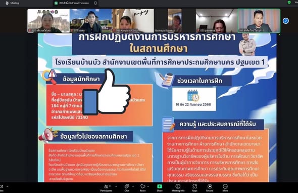 วันเสาร์ที่ 25 ตุลาคม พ.ศ.2568 นักศึกษาสาขาวิชาการบริหารการศึกษานำเสนอสรุปผลการฝึกปฏิบัติงานการบริหารการศึกษา SSRUผู้นำการสร้างมืออาชีพ โดยมี ผศ.ดร.เยาวภา บัวเวช เป็นอาจารย์นิเทศน์ ในรูปแบบออนไลน์